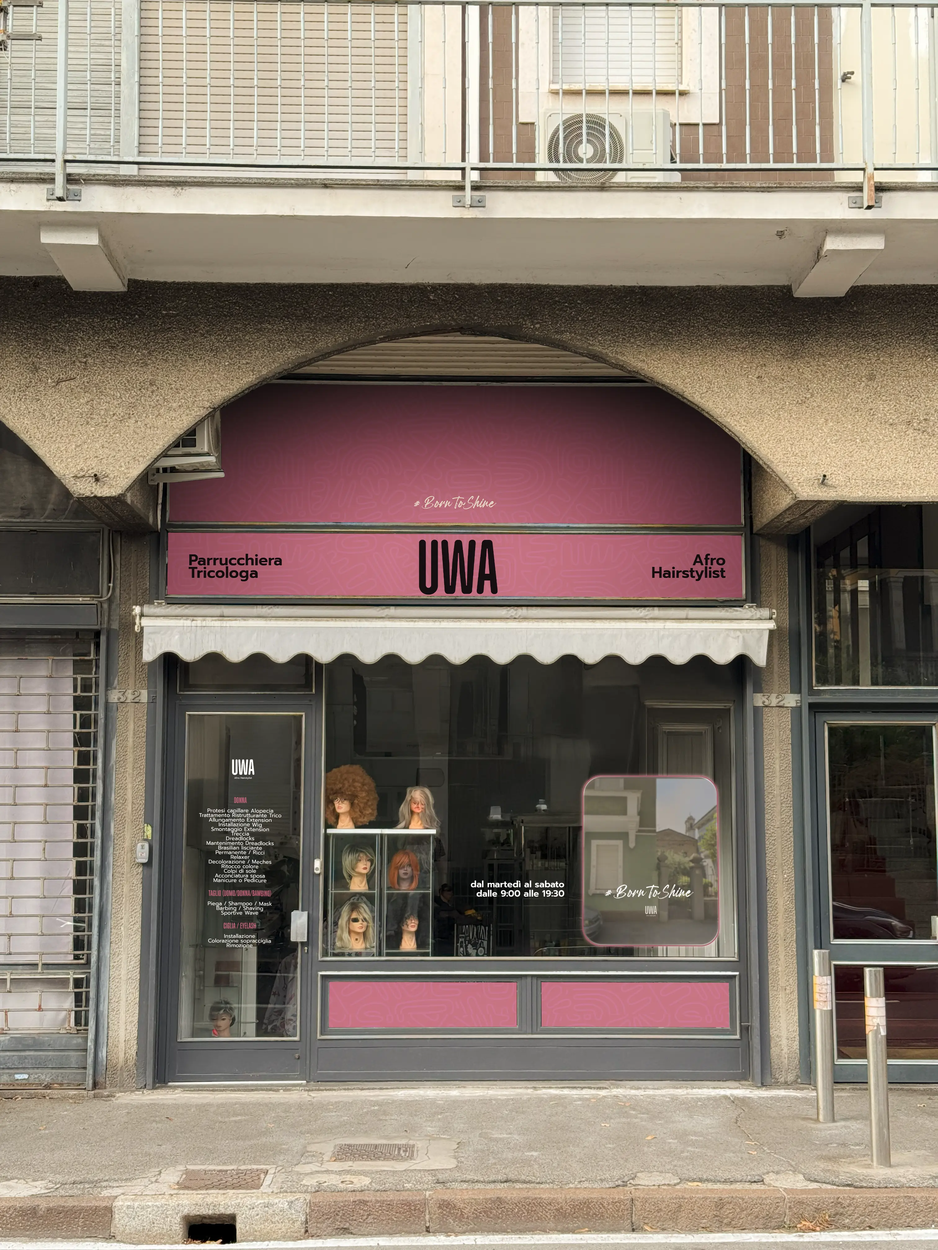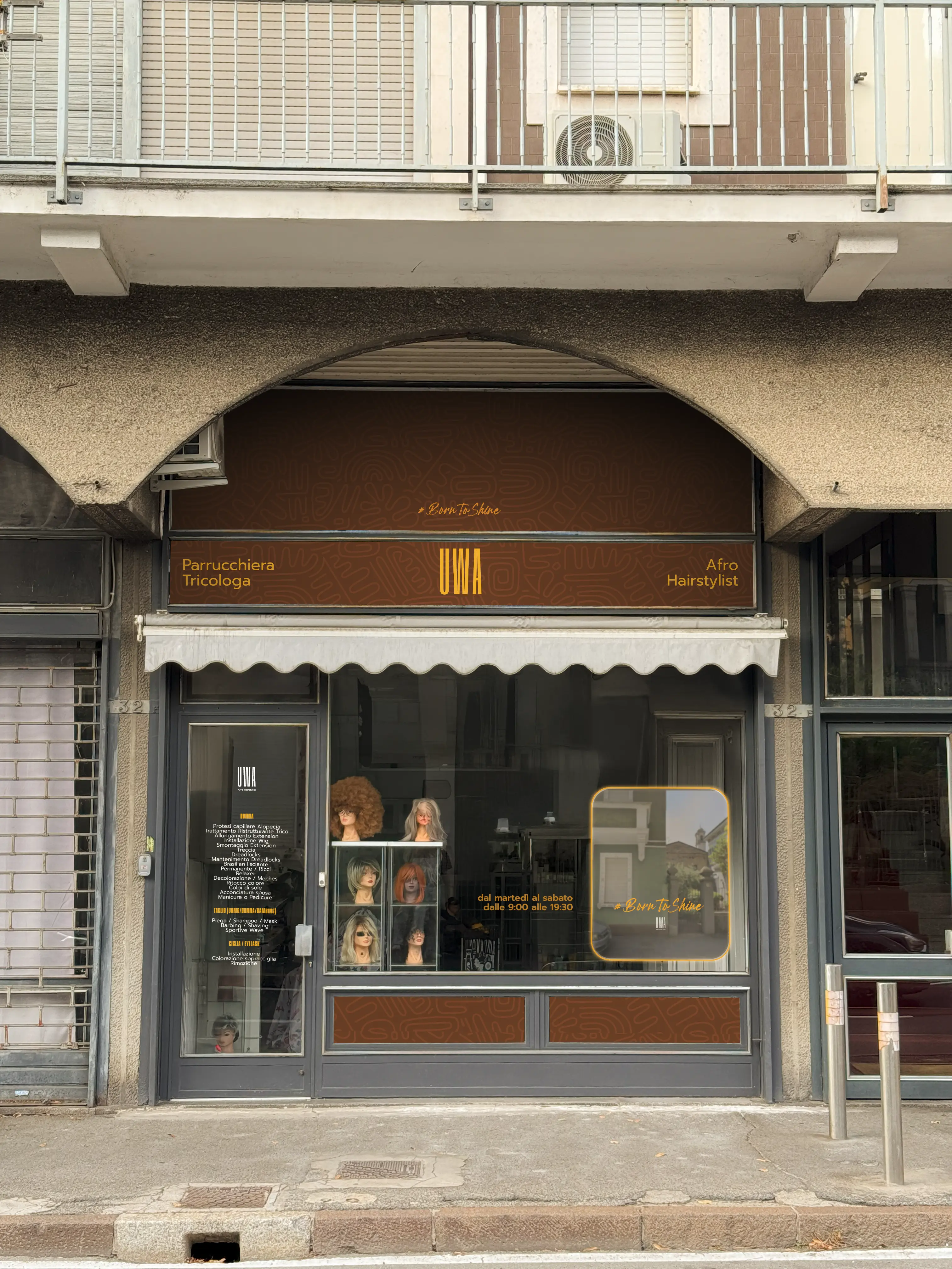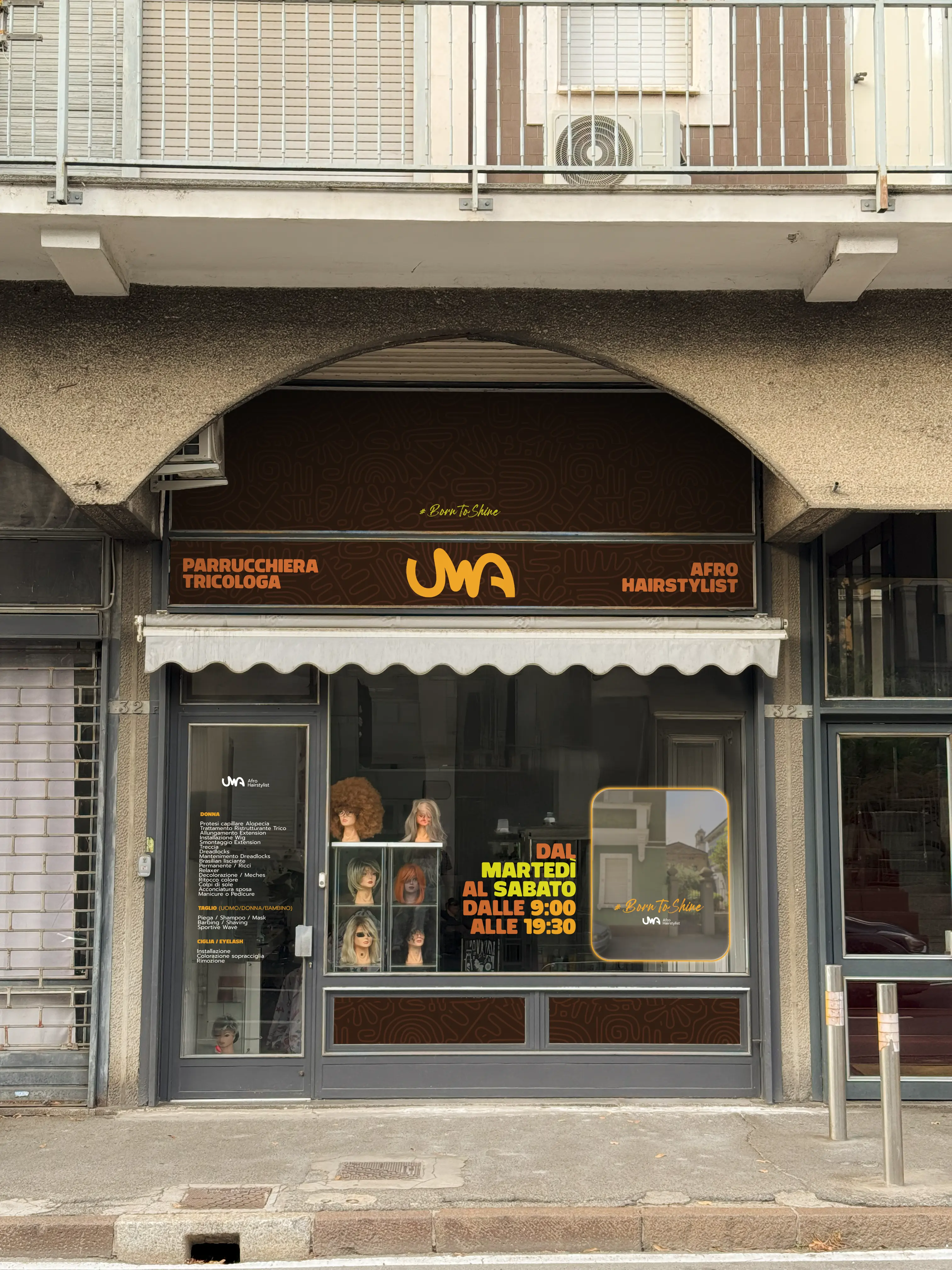 Nel caso di UWA Afro Hairstyle, ogni passaggio, dalla progettazione dei loghi alla realizzazione dei render realistici della vetrina, è stato pensato per restituire un’immagine che funzioni nella vita reale: elegante, leggibile, coerente e visibile anche a distanza.